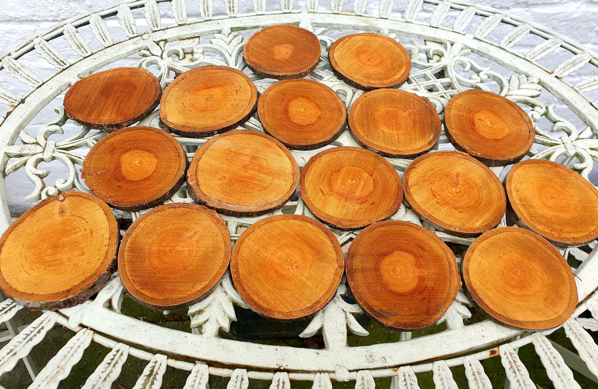 Live edge rustic farmhouse coasters. Made from natural cherry Wood. Which has a beautiful oaker colour. Keep your beverage warmer longer and protect your furniture. Ideal for home camper or weddings. Approx 75mm in diameter.